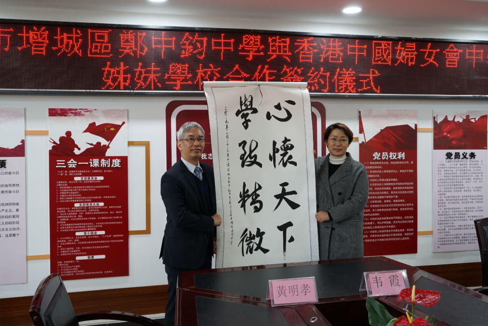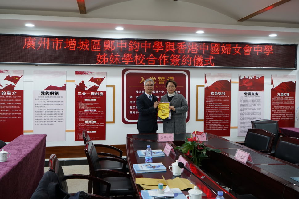 本年1月22日,由校長親率四位老師前往廣州市增城縣鄭中鈞中學參訪及交流。喜蒙鄭中鈞中學韋霞校長及一眾老師的熱情招待,我校老師們除參觀該校優美的校園環境與學生宿舍,亦特意觀摩課堂,以深入了解當地學生的學習及生活環境。及後,兩校進行了締結姊妹校簽約儀式並互贈紀念品,正式開展兩校學術交流的全新扉頁。Date: 22/01/2019